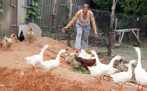 8月16日原平市新原鄉(xiāng)新華街村農民正在喂養(yǎng)鵝和雞。該市農民多措并舉因地制宜發(fā)展特色養(yǎng)殖業(yè)促增收。(趙月仁 攝)