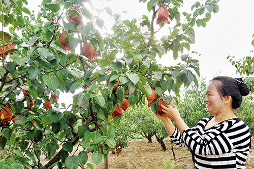 走進梨園,記者看到,一排排梨樹枝粗葉茂,大大小小的套袋酥梨掛滿了枝頭,等待著人們的采摘。“以前就是每家有那么幾棵樹,零零散散不成氣候。現(xiàn)在形成了規(guī)?;N植,在市場上也打出了品牌?!蓖跫t麗指了指周邊一眼看不到盡頭的梨園,介紹說這都是同村的村民種植的。為了符合人們現(xiàn)在純天然、綠色、無污染的消費需求,所有的梨在剛成形時就被套上了袋子,不再打農藥。“現(xiàn)在各家各戶都開始采摘了,再過幾天,就會有各地來的經(jīng)銷商統(tǒng)一收購。”