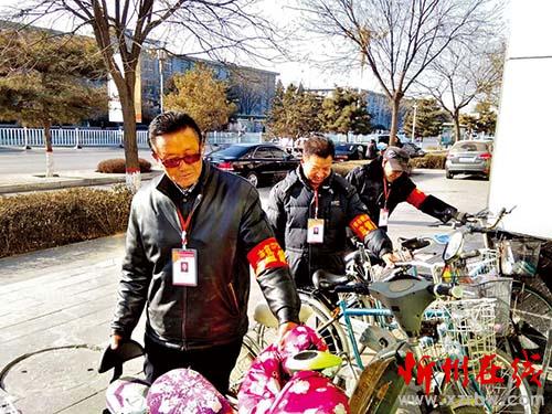 張明亮(中)與隊員們整理街頭的自行車