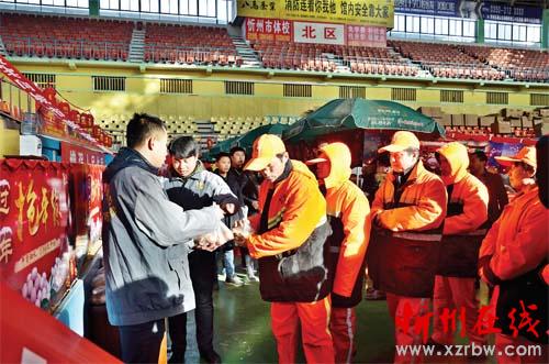 1月19日上午,山西熊奪寶網(wǎng)絡科技有限公司面向忻州市環(huán)衛(wèi)系統(tǒng)開展“獻愛心迎佳節(jié)”活動,來自忻州市市容環(huán)境衛(wèi)生管理處的50名環(huán)衛(wèi)工人代表,每人領到了一份新鮮雞蛋。現(xiàn)場的一位工作人員告訴記者:“環(huán)衛(wèi)工人們?yōu)榱顺鞘械母蓛粽麧嵏冻隽诵燎诘暮顾?,希望這些雞蛋能為他們補補身體。除現(xiàn)場領取雞蛋的50名環(huán)衛(wèi)工人之外,我市另外的1000多名環(huán)衛(wèi)工人也將陸續(xù)領到愛心雞蛋?!鳖I到雞蛋的環(huán)衛(wèi)工李大姐高興地說:“今年過年雞蛋也不用買了,實在是太好了!”(王菲 郭劍鳴 攝)