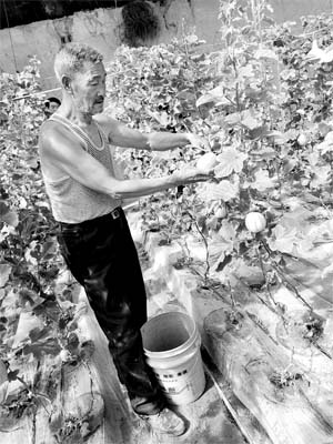 4月11日,忻府區(qū)部落村金山農(nóng)業(yè)示范園區(qū),68歲的村民馮永安在自己的大棚內(nèi)采摘香瓜。七年前,他敢嘗敢試開始種植大棚香瓜,每到這個香瓜上市的季節(jié),他和老伴吃住在大棚,精心待弄這些寶貝疙瘩,光這一畝大棚香瓜,每年都可以給他帶來十萬元左右的收入。尤其是近兩年,他自創(chuàng)科學(xué)方法,改良連種土壤,使香瓜的品質(zhì)、產(chǎn)量都保持穩(wěn)定勢頭,深受市場歡迎。他不僅帶動本村村民共同致富,而且為慕名而來的同行熱心傳授技術(shù),成為遠近聞名的大棚香瓜種植專家。本報記者 聶艷英 攝