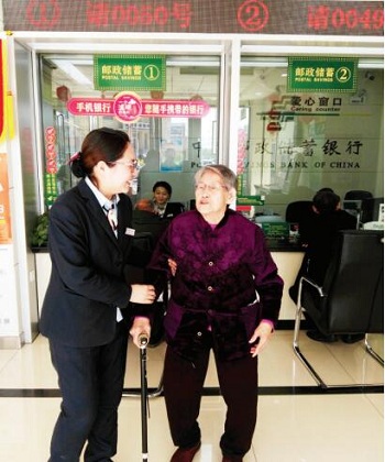 城區(qū)利民街西口郵政儲(chǔ)蓄銀行員工熱情為客戶(hù)服務(wù),受到群眾好評(píng)。圖為該行客服經(jīng)理微笑攙扶、護(hù)送八旬老客戶(hù)辦理完業(yè)務(wù)后離開(kāi)大廳。王金龍 攝