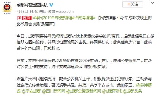 4月8日,成都網(wǎng)警對(duì)此辟謠稱:接網(wǎng)民問詢“成都夜晚上街露紋身會(huì)被抓”真假,據(jù)悉此信息已在微信朋友圈內(nèi)流傳,并冠以掃黑除惡的由頭。經(jīng)網(wǎng)警核實(shí),此條信息為謠言,此前曾在外地出現(xiàn),已被辟謠。目前,本市掃黑除惡專項(xiàng)斗爭仍在持續(xù)縱深推動(dòng),在此,成都公安感謝廣大群眾對(duì)公安工作的支持,對(duì)平安成都建設(shè)做出的積極貢獻(xiàn)。希望廣大市民繼續(xù)支持、配合公安機(jī)關(guān)工作,積極提供違法犯罪線索,主動(dòng)參與社會(huì)治安綜合治理,警民攜手共建、共治、共享平安城市、美麗家園。
