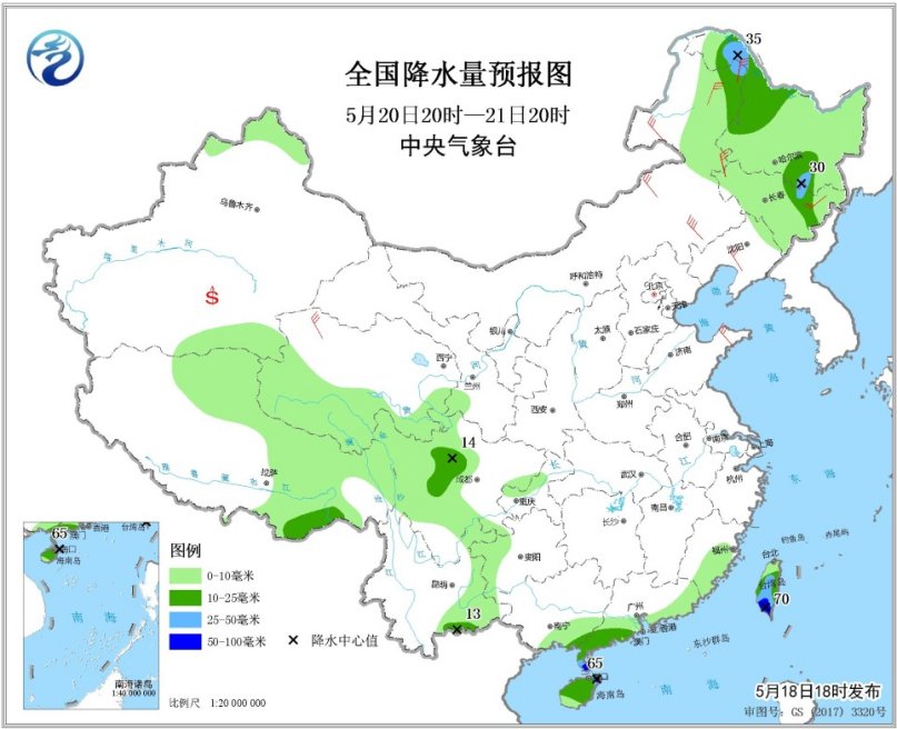 5月20日20時至21日20時,四川盆地西部、黑龍江西北部和東南部、吉林東北部、廣東西南部、廣西東南部、海南島東北部等地的部分地區(qū)有中到大雨,局地有暴雨(50~65毫米)。內(nèi)蒙古東部、東北地區(qū)中南部、華北北部、黃淮東部等地的部分地區(qū)有4~6級風。南疆盆地等地局地有浮塵或揚沙。
