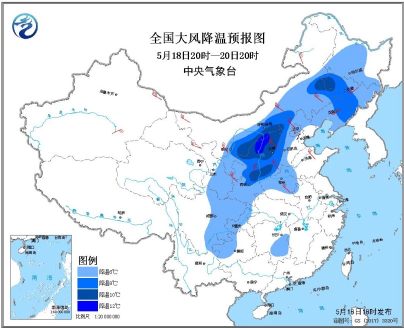 預計,5月18日20時至20日20時,西北地區(qū)大部、華北大部、東北地區(qū)、黃淮、新疆等地的部分地區(qū)有5~7級風,陣風可達8~9級,其中,內(nèi)蒙古中部和東部、山西北部、河北北部等地局地陣風可達10級以上;東北地區(qū)大部、華北中東部、黃淮西部、西北地區(qū)東部、西南地區(qū)東部等地最低溫度或平均溫度將下降6~8℃,其中,內(nèi)蒙古中部偏南地區(qū)、陜西北部、山西北部、吉林西部等地的部分地區(qū)降溫10℃以上。中央氣象臺5月18日18時繼續(xù)發(fā)布大風降溫預報。