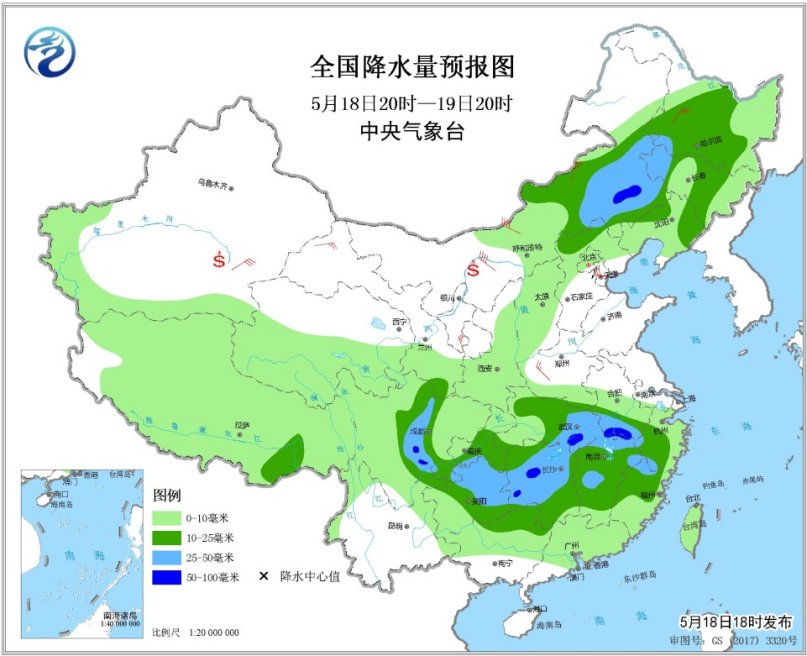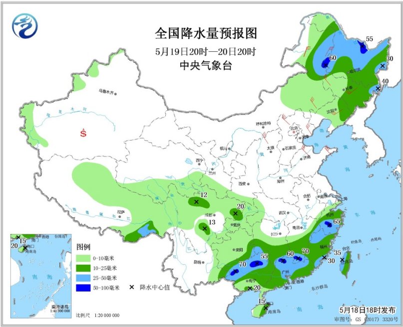 5月19日20時至20日20時,內(nèi)蒙古東北部、東北地區(qū)中北部、江南南部和東部、華南大部等地的部分地區(qū)有中到大雨,局地有暴雨(50~70毫米)。內(nèi)蒙古中東部、華北、黃淮、東北地區(qū)中南部等地的部分地區(qū)有4~6級風,陣風7~8級。南疆盆地等地局地有揚沙或浮塵。渤海西南部海域?qū)⒂?~8級、陣風9~10級的西北風。