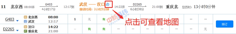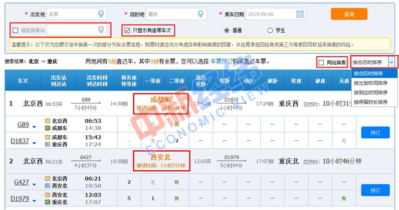 在信息篩選完畢后,大家可以從黃色字體標(biāo)注的車站和時間信息,得知是否在同一車站換乘以及接續(xù)時間。需要注意的是,不同的換乘地點一般接續(xù)時間不一樣,大家應(yīng)充分考慮各種影響換乘的因素,預(yù)留充分的時間搭乘下一趟列車。