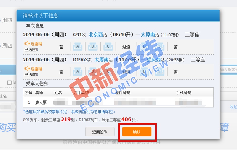 4、一切準(zhǔn)備就緒后,就可進(jìn)行車票預(yù)訂了。點擊“預(yù)訂”后,系統(tǒng)會再次對換乘信息進(jìn)行提示,確認(rèn)無誤后選擇對應(yīng)車次所需席別,添加乘車人信息。