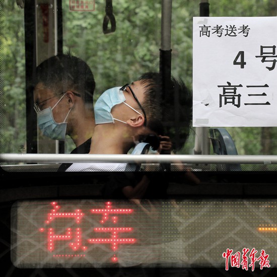 7月7日上午,四川省成都市,剛剛參加完高考語(yǔ)文考試的一位考生坐在車上閉目養(yǎng)神。由于考點(diǎn)不在本校,這位學(xué)生所在的學(xué)校安排了專車接送考生。中青報(bào)·中青網(wǎng)記者 王鑫昕/攝