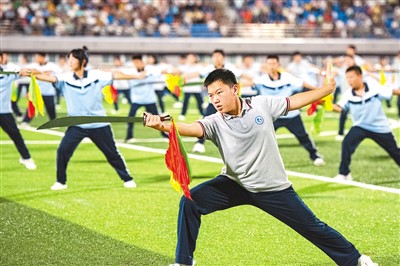 圖為8月8日,在安徽省蕪湖市繁昌區(qū)人民體育場,孫村初中學(xué)生進行太極單刀武術(shù)項目展演。肖本祥攝(人民視覺)
