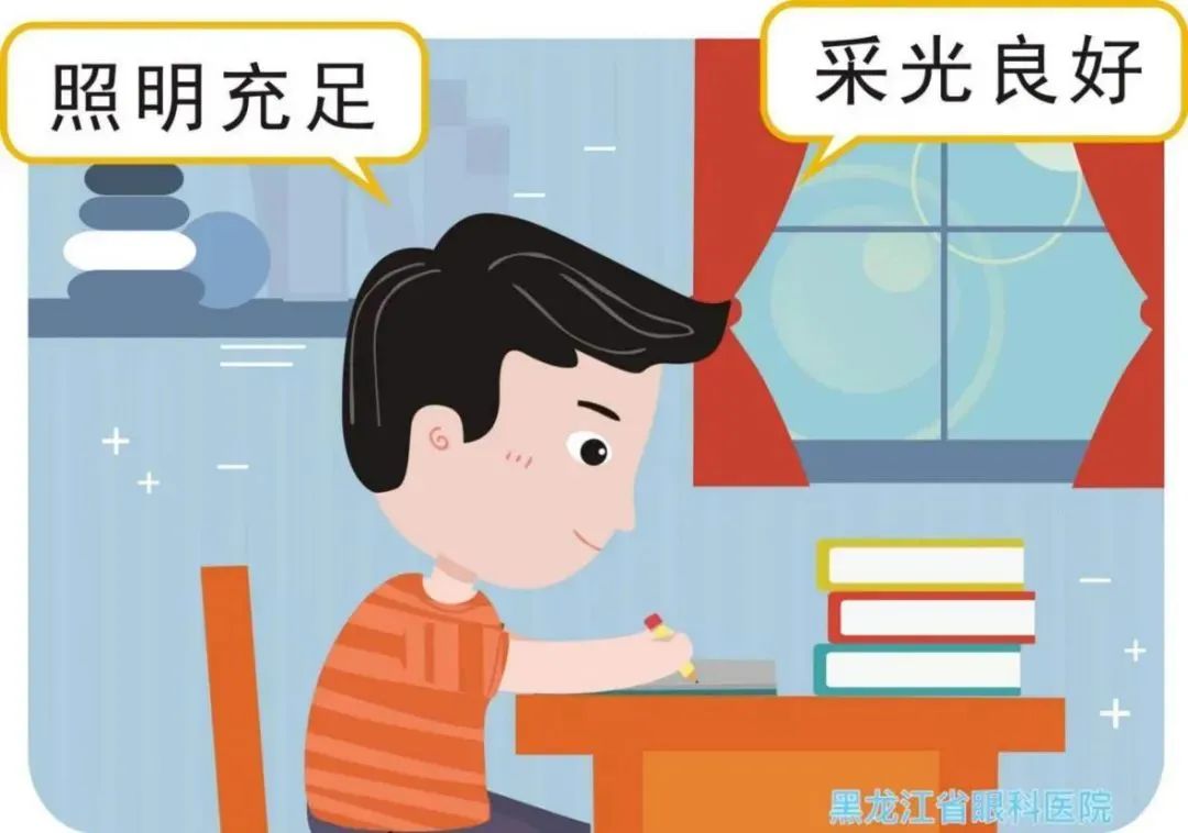 讀書寫字時(shí),光線應(yīng)從左前方照射(如用左手寫字,光線應(yīng)從右前方照射),避免陰影遮擋視線;使用臺(tái)燈時(shí),學(xué)習(xí)桌面的亮度要均勻,房間里的房燈應(yīng)同時(shí)打開(不宜用彩色燈光);看電視時(shí),應(yīng)保持適當(dāng)距離,電視屏幕的高度應(yīng)與人的視線平行或稍微低一些。