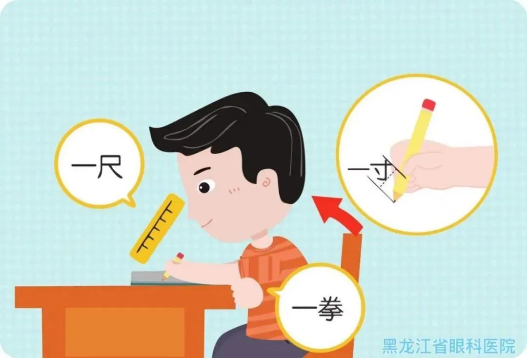 眼睛的調(diào)節(jié)量與視近距離有直接的關(guān)系,保持正確的讀寫姿勢(shì)可以減少眼睛的調(diào)節(jié)負(fù)擔(dān),防止視疲勞加重。堅(jiān)持“三個(gè)一原則”,即“眼離書本一尺遠(yuǎn)、胸離書桌一拳遠(yuǎn)、手離筆尖一寸遠(yuǎn)”。