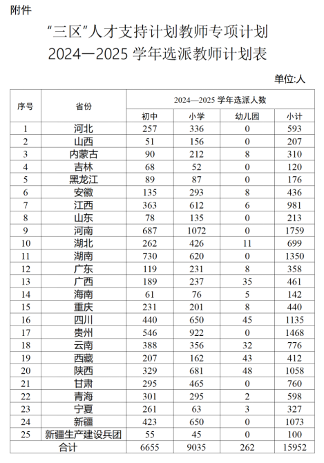 根據(jù)《通知》,2024—2025學(xué)年全國計(jì)劃選派15952名教師,其中初中計(jì)劃選派6655名,小學(xué)計(jì)劃選派9035名,幼兒園計(jì)劃選派262名。選派教師主要由各省(區(qū)、市)和新疆生產(chǎn)建設(shè)兵團(tuán)在本行政區(qū)域范圍內(nèi)調(diào)配,調(diào)動(dòng)省會(huì)城市、中心城市、非受援縣的優(yōu)質(zhì)教師資源支持省內(nèi)受援縣。