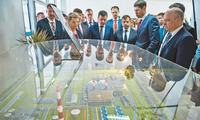中國和俄羅斯合資建設(shè)的華電捷寧斯卡婭燃?xì)庹羝?lián)合循環(huán)供熱電站項(xiàng)目投產(chǎn)儀式6月20日在俄羅斯雅羅斯拉夫爾市舉行。圖為嘉賓參觀華電捷寧斯卡婭電站項(xiàng)目沙盤模型。新華社發(fā)