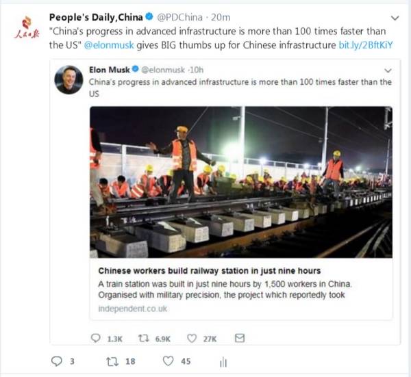 央廣網(wǎng)北京2月28日消息 近年來(lái),中國(guó)速度日益引發(fā)外媒關(guān)注。今天(28日),一段中國(guó)工人在火車站施工的視頻又走紅美國(guó),剛剛將跑車送上太空的企業(yè)家馬斯克(Elon Musk)也忍不住轉(zhuǎn)發(fā)贊嘆,“中國(guó)先進(jìn)基礎(chǔ)設(shè)施發(fā)展速度比美國(guó)快了100多倍”。