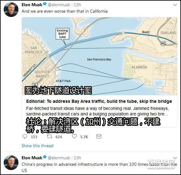 感嘆完中國(guó)速度,馬斯克又聯(lián)想到美國(guó)加利福尼亞州和紐約市擁堵的交通情況,并“憤怒三連發(fā)”,稱“我們?cè)诩又莺图~約都做得更差”。