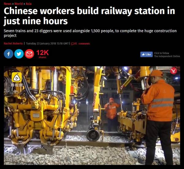 報(bào)道以《中國(guó)工人建火車站只要9個(gè)小時(shí)》為標(biāo)題,并稱中國(guó)的先進(jìn)基建工程讓人“嘆為觀止”。