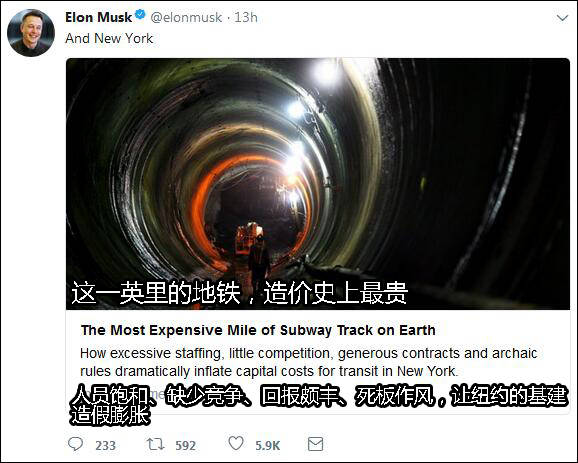 馬斯克不僅發(fā)火箭、造汽車,他旗下的Boring公司,正著手通過(guò)“鼴鼠計(jì)劃”(鋪設(shè)地下高速公路),試圖改善美國(guó)這兩個(gè)地方的交通。彭博社曾表示,馬斯克也算是深知美國(guó)基建行業(yè)的業(yè)內(nèi)人士。