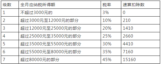 注意稅率表里有一欄“速算扣除數(shù)”。速算扣除數(shù)是指為解決超額累進稅率分級計算稅額的復(fù)雜技術(shù)問題,而預(yù)先計算出的一個數(shù)據(jù)。
