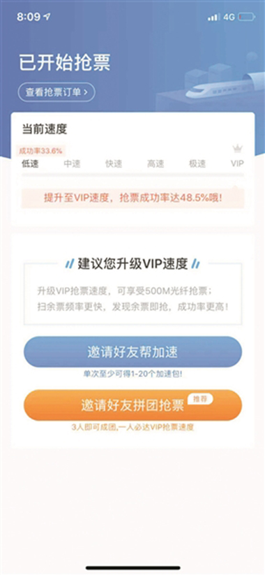 相比祝先生的贊,王女士感覺像是搶票軟件設(shè)置的噱頭,讓大家分享朋友圈給軟件做宣傳,她先后多次讓朋友為自己加速,感覺都要“飛起來了”,也沒搶到自己想要的車票。同時(shí),上海的肖先生表示,自己多次使用該軟件后發(fā)現(xiàn),“加錢或不加錢,只是在界面上顯示搶到票的概率數(shù)字會(huì)增加,其實(shí)并沒有感到有什么區(qū)別。”