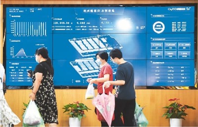 浙江省杭州市的5G農(nóng)貿(mào)市場——駱家莊農(nóng)貿(mào)市場的大屏幕上實(shí)時(shí)顯示交易、客流等相關(guān)情況。新華社記者 韓傳號攝