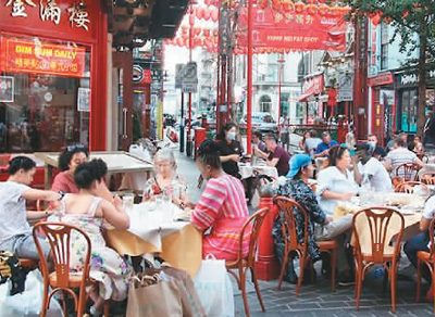 圖為2020年8月9日,英國(guó)倫敦一家中餐館座無(wú)虛席。