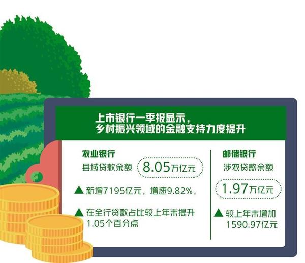 近日,各家上市銀行一季報先后披露完畢。從公開數(shù)據(jù)看,中國農(nóng)業(yè)銀行、中國郵政儲蓄銀行等在鄉(xiāng)村振興領域的金融支持力度持續(xù)提升。其中,農(nóng)業(yè)銀行縣域貸款余額達8.05萬億元,新增7195億元,增速9.82%,增量創(chuàng)歷史同期新高,在全行貸款占比較上年末提升1.05個百分點。郵儲銀行涉農(nóng)貸款余額1.97萬億元,較上年末增加1590.97億元;建成信用村38.69萬個,評定信用戶超千萬戶,主動授信白名單客戶貸款本年凈增366.20億元。