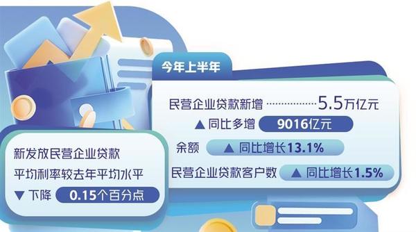 近年來,信貸支持民營企業(yè)的力度不斷加大,融資成本穩(wěn)中有降。數(shù)據(jù)顯示,今年上半年,民營企業(yè)貸款新增5.5萬億元,同比多增9016億元,余額同比增長13.1%;民營企業(yè)貸款客戶數(shù)同比增長1.5%;新發(fā)放民營企業(yè)貸款平均利率較去年平均水平下降0.15個(gè)百分點(diǎn)。