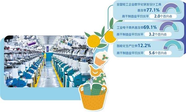 “以輕工業(yè)為例,全國(guó)輕工企業(yè)數(shù)字化研發(fā)設(shè)計(jì)工具普及率77.1%,工業(yè)電子商務(wù)普及率69.1%,分別高于制造業(yè)平均水平2.0個(gè)和3.2個(gè)百分點(diǎn)?!蓖跣⒀笳f(shuō)。