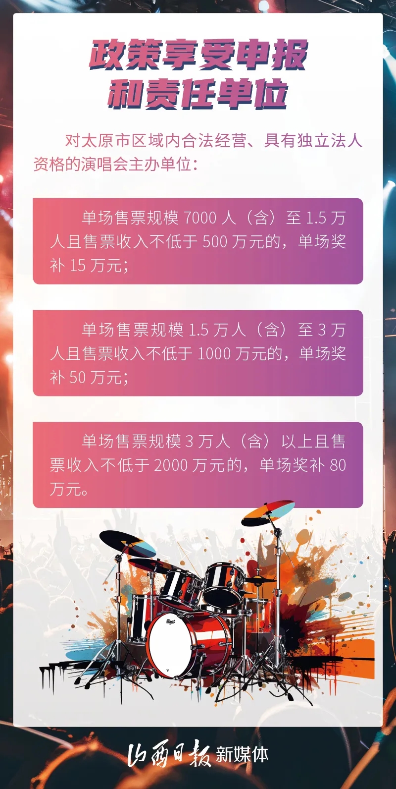 為做大太原市演唱會經(jīng)濟,加快建設華北地區(qū)重要演藝中心,打造“國內(nèi)外重要文化旅游目的地”,日前,太原市發(fā)展和改革委、市文化和旅游局、市財政局等11個部門聯(lián)合制定出臺《支持演唱會經(jīng)濟發(fā)展的若干措施(試行)》。
