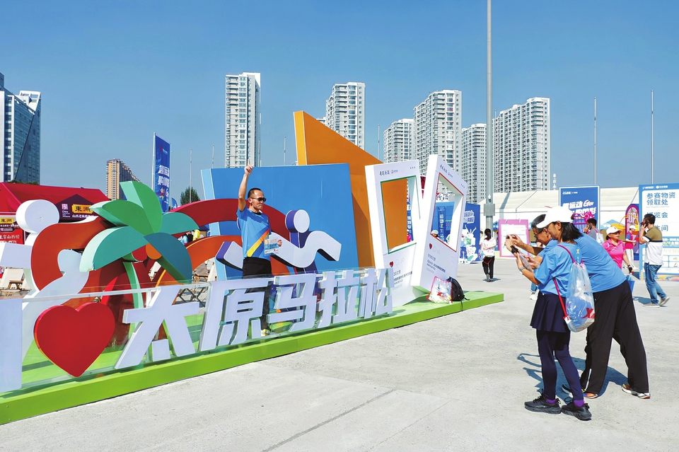 9月19日,2024太原體育消費(fèi)周啟動儀式在省城晉陽湖國際會展中心舉行。圍繞開賽在即的太原馬拉松賽,體育消費(fèi)周在該中心推出互動娛樂游戲、文體產(chǎn)品展示銷售、特色美食市場等十余項特色活動。圖為參賽選手在展板前拍照留念。