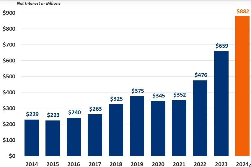 根據(jù)美國(guó)財(cái)政部11月20日公布的數(shù)據(jù),2024年美國(guó)聯(lián)邦政府僅用以償還美債利息的支出就達(dá)到了8820億美元。相較2023年6590億美元的利息支出,2024年美債利息支出增長(zhǎng)率達(dá)33.8%。