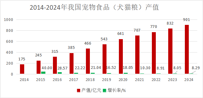 中國農(nóng)業(yè)科學(xué)院飼料研究所寵物營養(yǎng)團(tuán)隊(duì)數(shù)據(jù)統(tǒng)計(jì)顯示,2024年我國寵物犬貓飼養(yǎng)量達(dá)1.4億只,寵物產(chǎn)業(yè)總規(guī)模突破3000億元,其中寵物食品市場占比最高。到2024年,寵物食品犬貓糧市場規(guī)模達(dá)到900億元,比2023年增長8.3%。