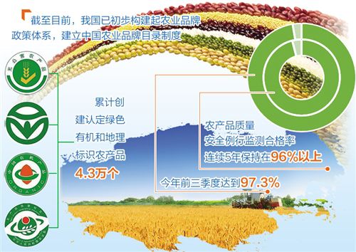 “中國農(nóng)業(yè)品牌正駛?cè)肟焖俳】蛋l(fā)展的快車道,成為現(xiàn)代農(nóng)業(yè)發(fā)展的亮麗風(fēng)景?!鞭r(nóng)業(yè)農(nóng)村部部長韓長賦表示,近年來我國大力實(shí)施品牌強(qiáng)農(nóng)戰(zhàn)略,取得了積極成效。截至目前,已初步構(gòu)建起農(nóng)業(yè)品牌政策體系,建立中國農(nóng)業(yè)品牌目錄制度。累計(jì)創(chuàng)建認(rèn)定綠色有機(jī)和地理標(biāo)識農(nóng)產(chǎn)品4.3萬個(gè),形成了一批特色地域名片。品牌化帶動了農(nóng)業(yè)生產(chǎn)標(biāo)準(zhǔn)化,農(nóng)產(chǎn)品質(zhì)量安全例行監(jiān)測合格率連續(xù)5年保持在96%以上,今年前三季度達(dá)到97.3%,更多優(yōu)質(zhì)農(nóng)產(chǎn)品受到消費(fèi)者青睞。