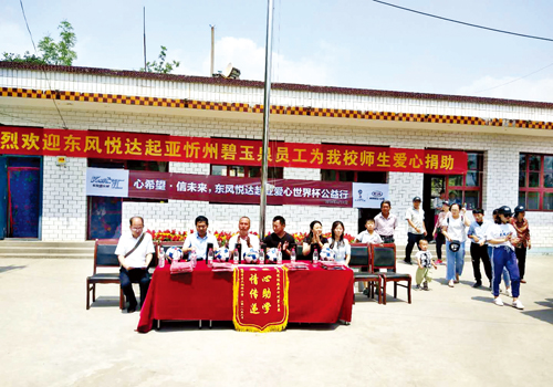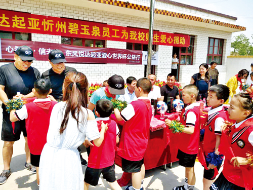 2018年6月2日“心希望信未來”東風(fēng)悅達起亞世界杯公益行活動如期成功舉行。本次活動由東風(fēng)悅達起亞廠家冠名支持,由忻州碧玉泉公司員工、部分保有客戶及家屬、意向客戶及媒體工作人員共60多人和代縣兩界溝小學(xué)全體師生共同參與。