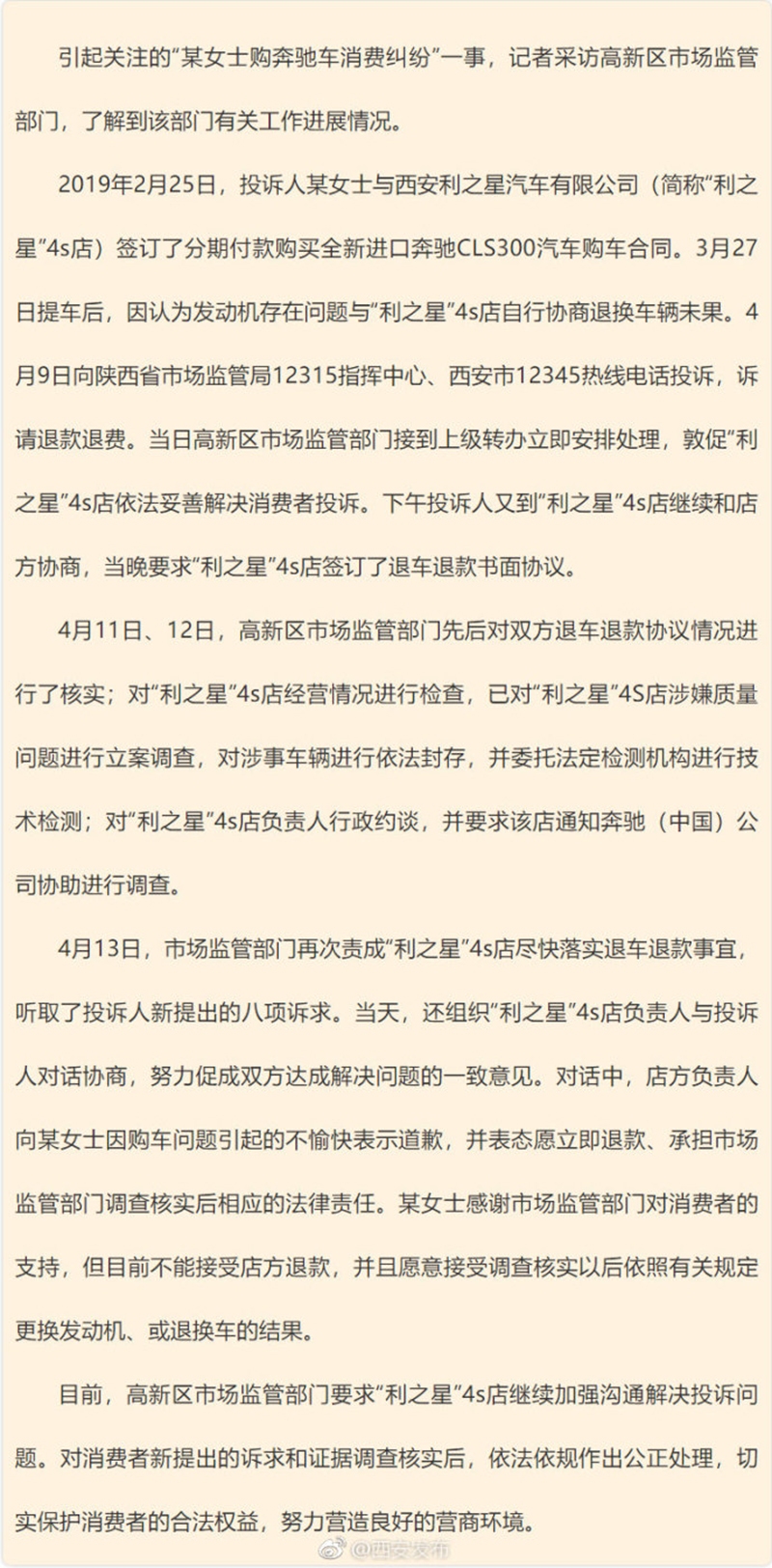 據(jù)西安市互聯(lián)網(wǎng)信息辦公室官方微博消息稱,4月13日,高新區(qū)市場(chǎng)監(jiān)管部門曾組織利之星4S店負(fù)責(zé)人與投訴人進(jìn)行對(duì)話協(xié)商。對(duì)話中,店方負(fù)責(zé)人向奔馳女車主因購(gòu)車問(wèn)題引起的不愉快表示道歉,并表態(tài)愿立即退款、承擔(dān)市場(chǎng)監(jiān)管部門調(diào)查核實(shí)后相應(yīng)的法律責(zé)任。該奔馳女車主感謝市場(chǎng)監(jiān)管部門對(duì)消費(fèi)者的支持,但目前不能接受店方退款,也愿意接受調(diào)查核實(shí)以后依照有關(guān)規(guī)定更換發(fā)動(dòng)機(jī)、或退換車的結(jié)果。