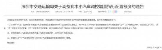 《深圳市交通運(yùn)輸局關(guān)于調(diào)整我市小汽車調(diào)控增量指標(biāo)配置額度的通告》內(nèi)容如下:2019年6月起,在原定每年普通小汽車增量指標(biāo)配置額度為8萬個的調(diào)控目標(biāo)基礎(chǔ)上,2019年至2020年每年增加投放普通小汽車增量指標(biāo)4萬個(個人指標(biāo)占88%,企業(yè)指標(biāo)占12%),其中,1萬個采取搖號方式配置,3萬個采取競價方式配置。2019年增加的4萬個指標(biāo)按月平均分配到2019年6-12月,2020年增加的4萬個指標(biāo)按月平均分配到全年12個月;使用新增的小汽車指標(biāo)在我市辦理小汽車注冊登記時,小汽車須符合國VI標(biāo)準(zhǔn);新增的4萬個小汽車指標(biāo)依照《深圳市小汽車增量調(diào)控管理實(shí)施細(xì)則》管理。