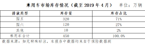 中汽協(xié)發(fā)布的數(shù)據(jù)顯示, 截至2019年4月份,我國(guó)乘用車(chē)庫(kù)銷(xiāo)比達(dá)3.1,遠(yuǎn)高于行業(yè)1.5的警戒線(xiàn);行業(yè)整體庫(kù)存約450萬(wàn)輛,國(guó)五車(chē)輛庫(kù)存320萬(wàn)輛左右(占行業(yè)庫(kù)存的71%),其中國(guó)六提前實(shí)施區(qū)域的國(guó)五車(chē)輛庫(kù)存175-220萬(wàn)輛(調(diào)研企業(yè)推算得出)。