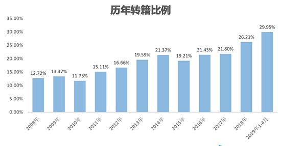 4月全國二手車市場(chǎng)交易量為120.06萬輛,環(huán)比下降4%,同比增長(zhǎng)4.29%;1-4月,二手車?yán)塾?jì)銷售445.63萬輛,同比增長(zhǎng)2.61%,跨城市交易額比例達(dá)到29.95%。羅磊表示,隨著全國各區(qū)域二手車流通的壁壘逐步消除,二手車全國自由流通越來越快捷,這一利好因素促使國內(nèi)二手車交易轉(zhuǎn)籍比例在過去10年里呈逐年上升趨勢(shì)。