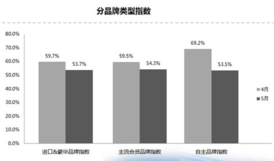 從數(shù)據(jù)上看,5月北區(qū)庫存預(yù)警指數(shù)為54.7%,東區(qū)指數(shù)為49.4%,南區(qū)指數(shù)58%,西區(qū)指數(shù)56.9%。分品牌來看,5月進(jìn)口&豪華品牌指數(shù)、合資品牌指數(shù)、自主品牌指數(shù)較上月下降;另由于部分省市7月1日提前實(shí)施國六標(biāo)準(zhǔn),5月經(jīng)銷商加大了對(duì)國五車清庫力度,總體庫存水平有所下降。