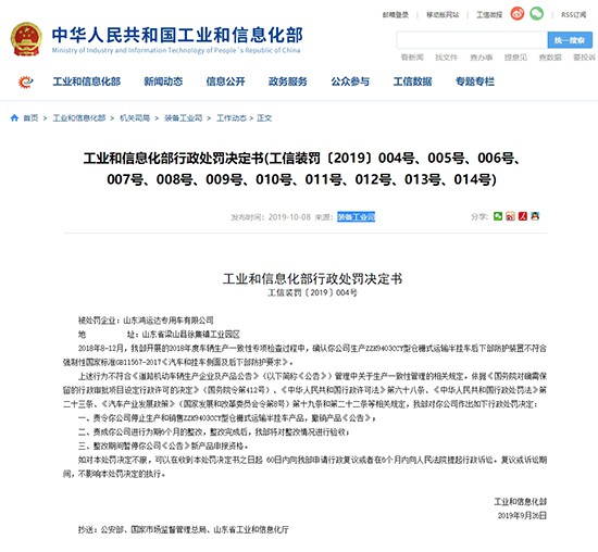 經(jīng)濟(jì)日報(bào)-中國經(jīng)濟(jì)網(wǎng)10月8日訊(記者 郭躍)今日,工業(yè)和信息化部(以下簡稱“工信部”)發(fā)布公告,對11家不符合《道路機(jī)動車輛生產(chǎn)企業(yè)及產(chǎn)品公告》(以下簡稱《公告》)管理中關(guān)于生產(chǎn)一致性管理相關(guān)規(guī)定的公司進(jìn)行行政處罰。處罰內(nèi)容包括停止以上11家公司生產(chǎn)和銷售違規(guī)產(chǎn)品,并撤銷產(chǎn)品《公告》;責(zé)成以上公司進(jìn)行為期6個月的整改;同時(shí),整改期間暫停公司《公告》新產(chǎn)品申報(bào)資格。