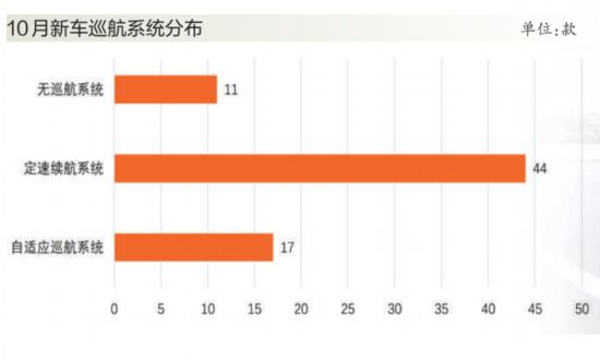 自適應(yīng)巡航系統(tǒng)在緩解疲勞和保障安全上有明顯優(yōu)勢(shì),在10月上市車(chē)型中,搭載該系統(tǒng)的新車(chē)有17款,如新款東風(fēng)日產(chǎn)天籟、一汽豐田榮放、長(zhǎng)安CS35、WEY VV5、吉利遠(yuǎn)景X6以及理想ONE等車(chē)型,均搭載有自適應(yīng)巡航系統(tǒng),甚至是全速自適應(yīng)巡航系統(tǒng)。與以往相比,自適應(yīng)巡航技術(shù)的滲透率有所提升,而定速巡航的應(yīng)用則更為廣泛,在各級(jí)別車(chē)型中均有分布。10月,搭載定速巡航的新車(chē)總數(shù)為44款,而不搭載任何巡航系統(tǒng)的車(chē)型共有11款,主要體現(xiàn)在定位較低車(chē)型上。