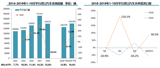 相比之下,平行進(jìn)口市場則實現(xiàn)逆勢上揚。1-10月,平行進(jìn)口汽車?yán)塾嬤M(jìn)口14.0萬輛,同比增長11.0%,占進(jìn)口總量的16.0%,創(chuàng)歷史新高。流通協(xié)會認(rèn)為,這主要是受國六實施等政策的影響。