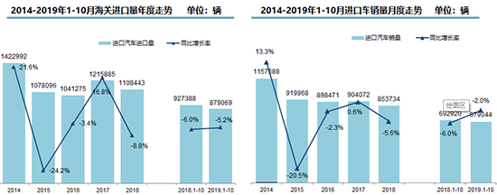同比微降2.0%,降幅相比2018年收窄3.6個百分點。其中,受2018年關(guān)稅稅率下調(diào)和國六實施影響,進(jìn)口車銷量大起大落,在二季度增長22.1%之后,市場再次進(jìn)入下行通道。
