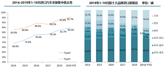 隨著品牌結(jié)構(gòu)的深度調(diào)整,進(jìn)口車市場品牌集中度持續(xù)提高。1-10月,進(jìn)口車前十大品牌占比達(dá)到84.9%,其中歐系品牌依然是絕對主力,德系占比達(dá)到45.2%,位居所有國別的第一位,但市場份額明顯下滑;作為第二大系別,日系在豐田、雷克薩斯的拉動下,份額大幅提升至34.5%,較去年提高6.8個百分點。此外,美系品牌市場份額回升至10.4%,韓系品牌則徹底退出進(jìn)口車市場。