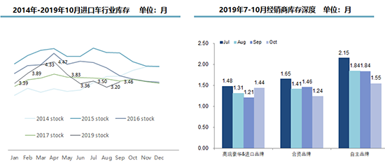 10月,進(jìn)口車經(jīng)銷商庫存深度為1.4個月,較前兩個月微升,但仍處于合理區(qū)間;行業(yè)全鏈條庫存回落到3.5個月,是近五年同期的最低點。流通協(xié)會方面認(rèn)為,今年進(jìn)口車庫存合理是供需雙降引起的,與2015-2016年去庫存導(dǎo)致的庫存合理有本質(zhì)區(qū)別。