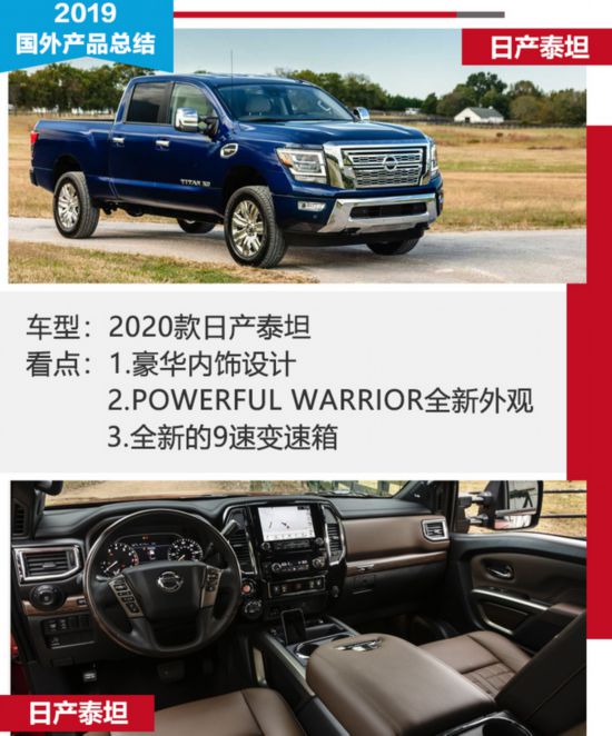 2019年9月,2020款日產(chǎn)泰坦正式發(fā)布,與其說是換代,不如說只是第二代H61的一次小的改款,仍然采用日產(chǎn)F-Alpha平臺。外觀上,日產(chǎn)稱其為“Powerful Warrior”,能從中看到此前概念車日產(chǎn)泰坦Warrior的影子。外觀上更加激進(jìn),動力上,將會提供一款升級的V8汽油發(fā)動機(jī),最大功率298kW,最大扭矩559N·m。原先的7速變速箱直接升級到了全新的9速變速箱,將提供“更平滑、以及更快的加速”。而且,在TitanXD上搭載的康明斯5.0升V8也將和消費(fèi)者說再見。