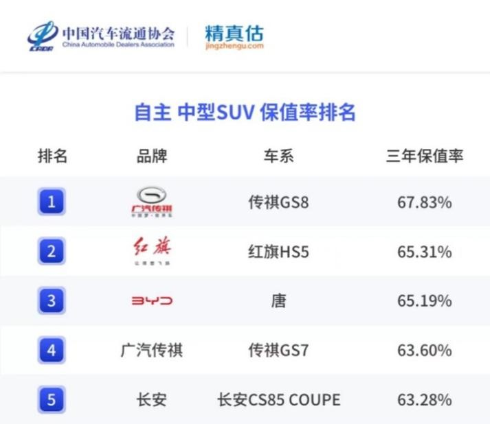 除了消費者用終端銷量為這款車投票以外,在中國汽車流通協(xié)會發(fā)布的《中國汽車品牌保值率報告》中,廣汽傳祺GS8成為了2021和2022年度的自主中型SUV保值率第一的車型,而在2023年1月和3月的報告當(dāng)中,GS8的保值率也穩(wěn)居第一,這相當(dāng)于二手車行業(yè)也肯定了這款車的價值。