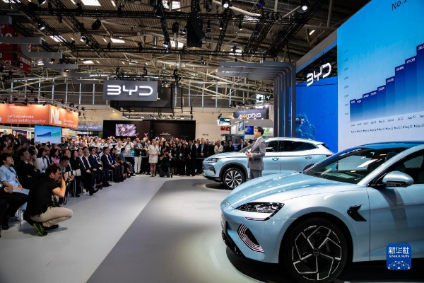 9月5日,人們?cè)诘聡?guó)慕尼黑國(guó)際車展的城市公共展示區(qū)參觀比亞迪汽車。