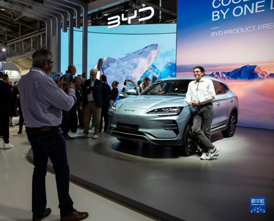 9月4日,在德國(guó)慕尼黑國(guó)際車展媒體預(yù)展上,參觀者在比亞迪品牌發(fā)布會(huì)現(xiàn)場(chǎng)與BYD SEAL U汽車合影。